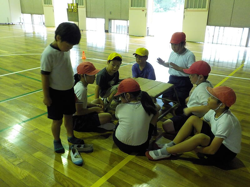 1年生は、先生のお話を上手に聞いていました! 学校探検をして、学校中を巡った後でした
