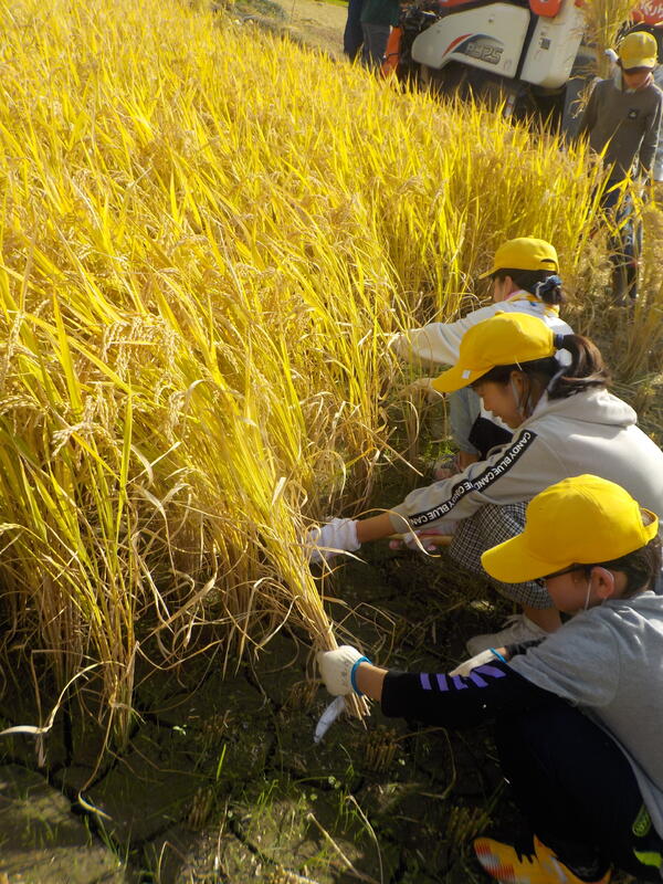 4年生も5年生も、やっていくうちにすぐに上手に稲刈りができるようになりました! すごい! みるみるうちに、刈る前の稲のある面積が狭くなっていきましたよ