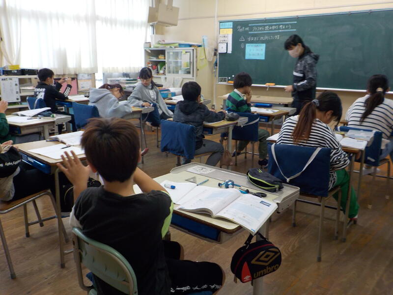6年生は算数の勉強。表を見て、比例を表す式を考えていました