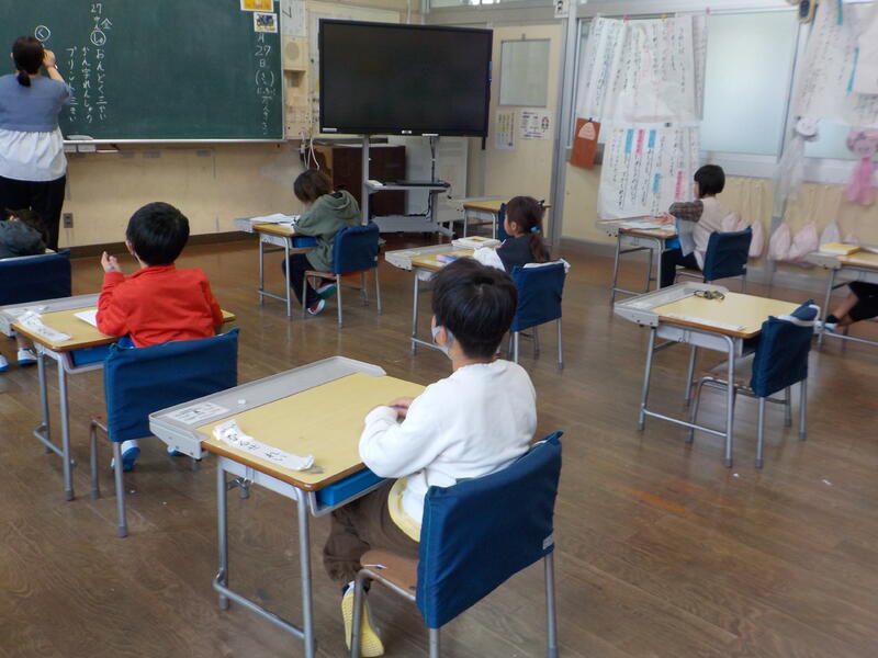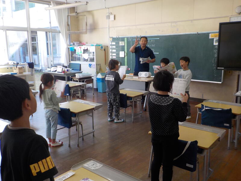1年生は、音楽の時間に「ひのまる♪」を歌っていました! とても良い歌声でしたよ! 前に出て歌う「お手本」を交代しながら歌っていました