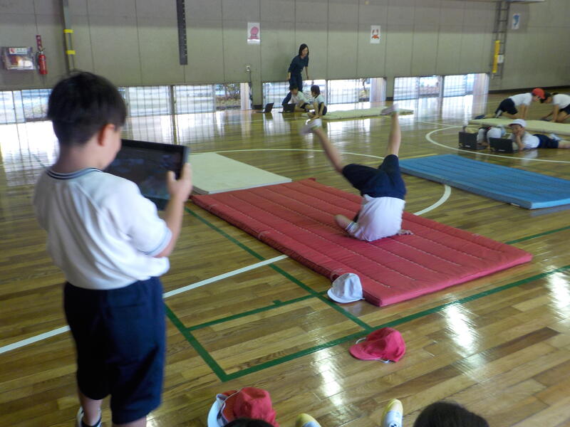 2、3年生は、体育でマット運動をしていました! タブレットで動画を撮って、上手くできているか確認しながら学習をすすめていました