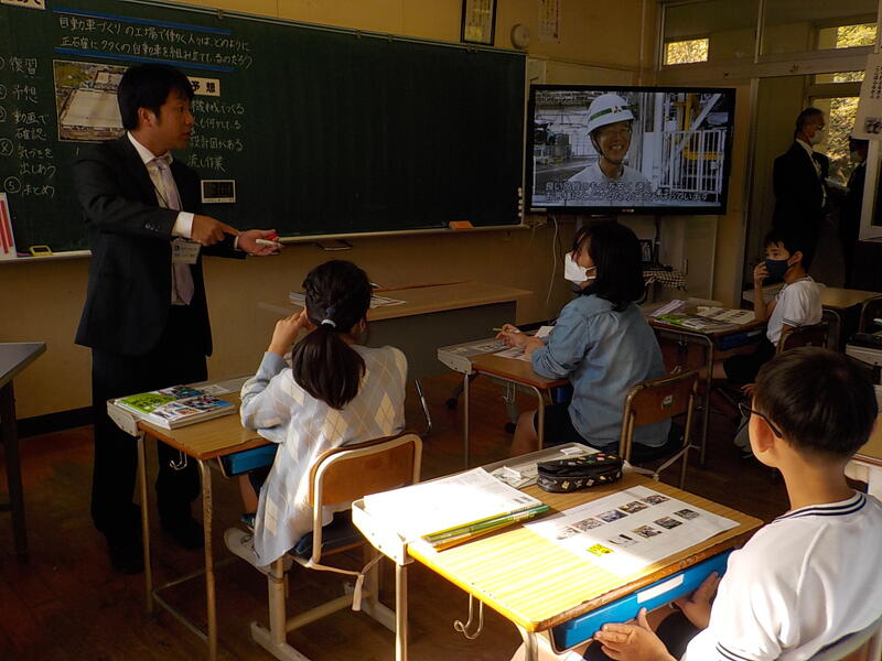5年生は、社会の「自動車をつくる工業」の学習で、「流れ作業」の利点について学んでいました