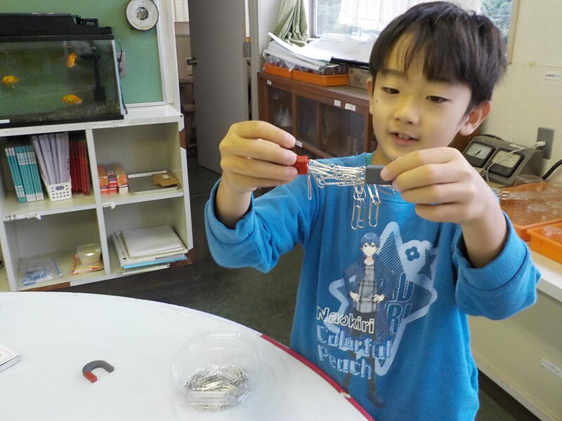 3年生は、理科の時間に「じしゃくのふしぎ」を見つけました! じしゃくにクリップをたくさんつけて、とても楽しんで学習できました