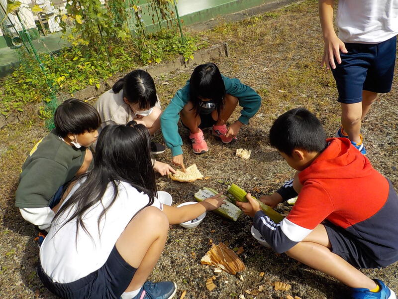 4年生は理科の時間に、畑になったへちまの実を解体しました! 茶色の実の中から198この新しいヘチマの種が出てきました