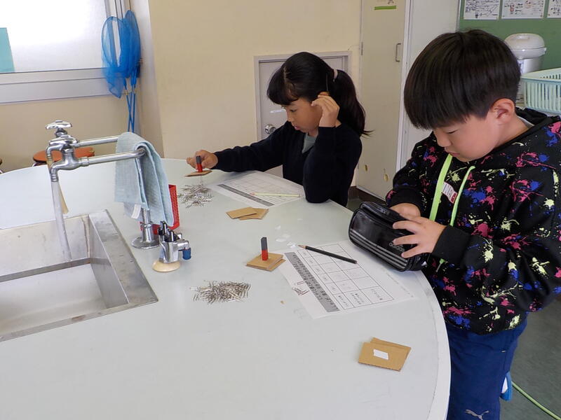 3年生は、昨日の学習の続きで、今度は磁力の強さについて調べる実験をしました! じしゃくに引きつけられる強さは、じしゃくとの距離が遠くなるほど弱くなることが分かりました