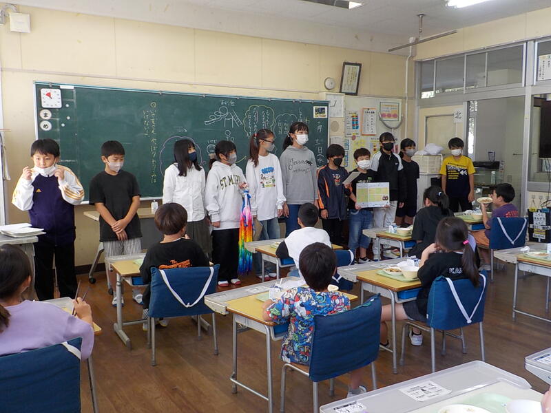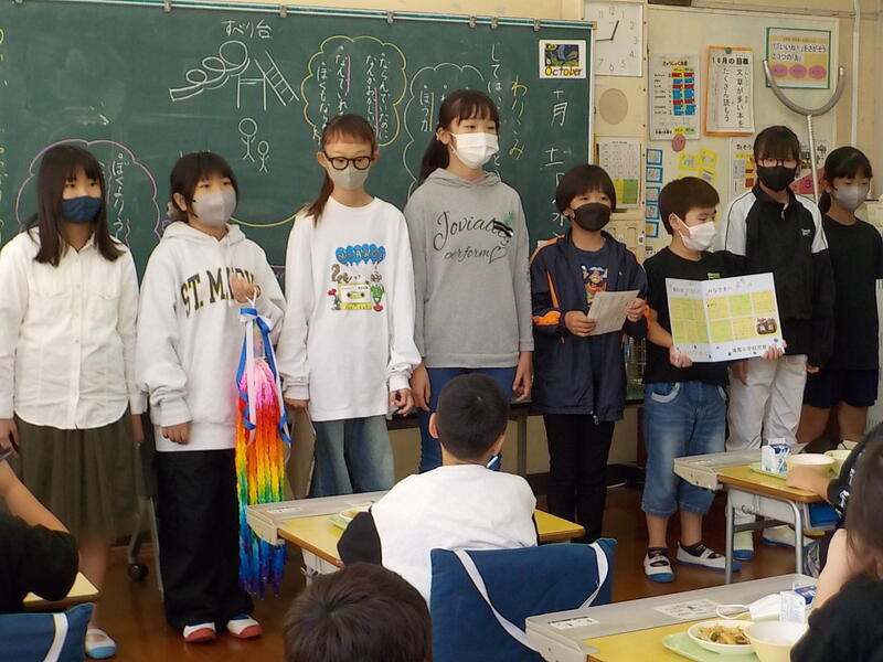 6年生が給食の時間に各教室をまわり、色紙と千羽鶴の紹介をしました!
