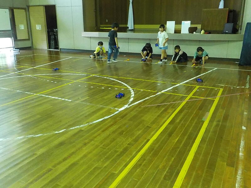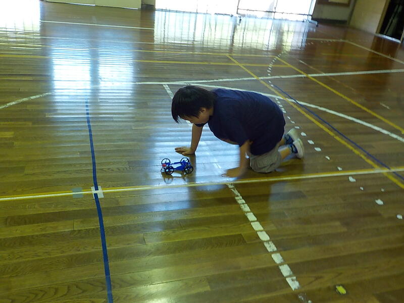 ゴムの力で走る車をゴールにピタッと止めるにはどうしたらいいか、子供たちは、「ああ、通りすぎたぁ!」、「次は、こんな工夫をしたら・・・」といろいろなことを考えて車を走らせていました