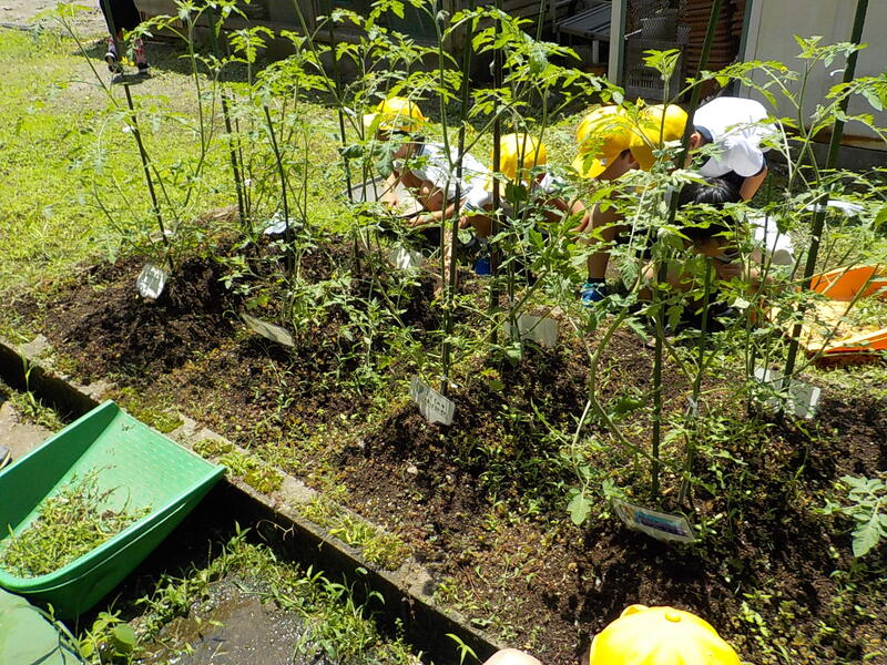 4年生は、自分が一年間の変化の様子を調べている「木」の写真を撮った後、畑の草取りをしました! 雑草を選り分けて上手に草取りができました