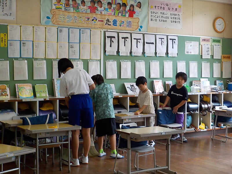 5年生と4年生は、書写の時間、ノートを広げてそれぞれ