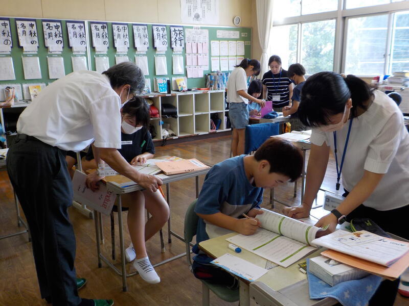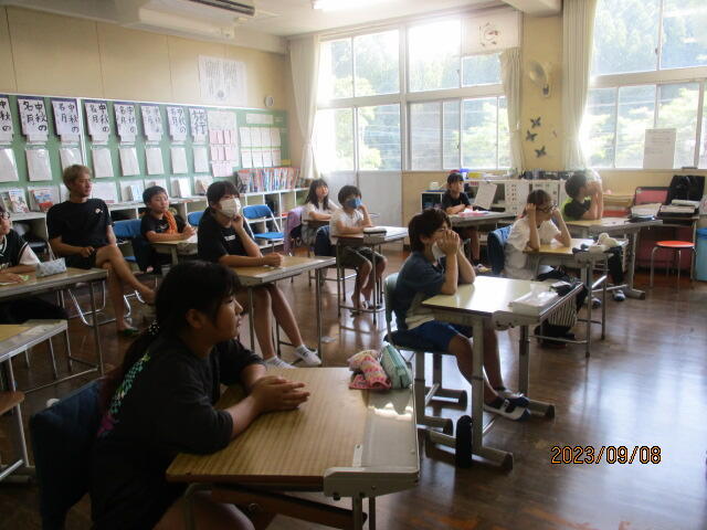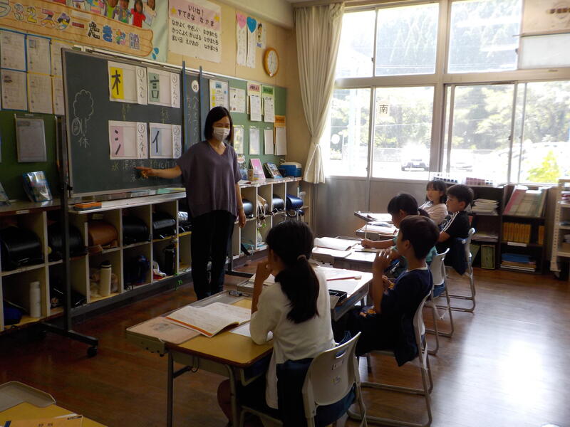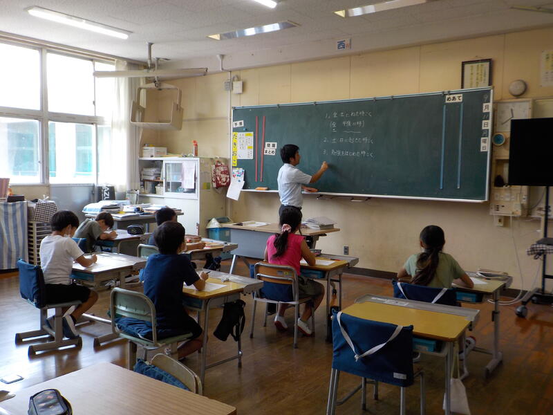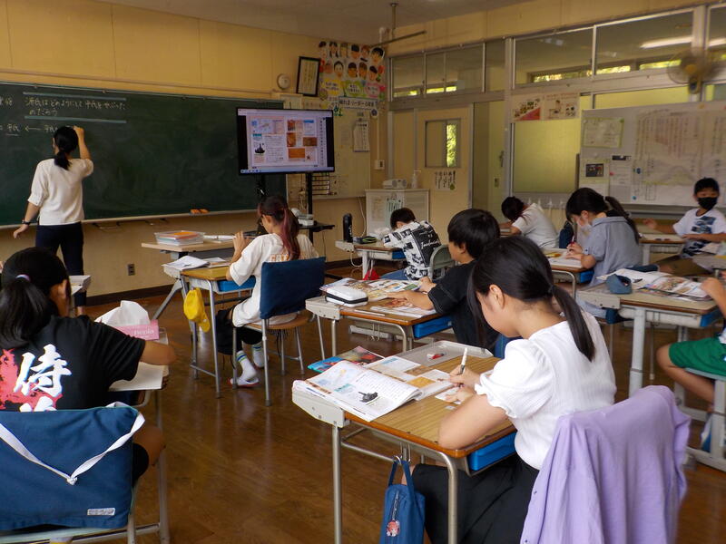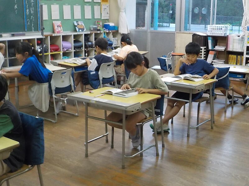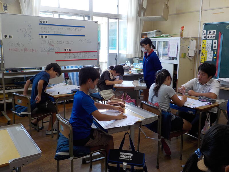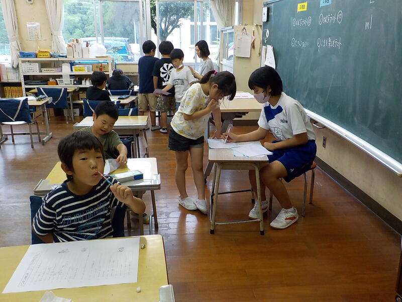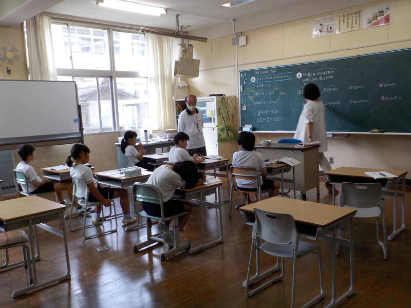 4年生と5年生は、算数の勉強。4年生は少数の数の仕組みを、5年生は割合を求める式の立て方を学習しました。同じ教室で、前と後ろを向いて・・・、真剣に学習を進めていました! 頑張っていますね