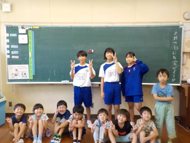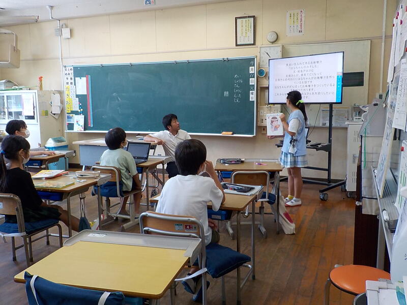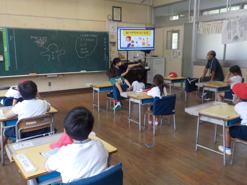 気温や湿度が高すぎて、熱中症の危険が高かったので、1年生は5時間目は教室で「食べると、どんないいことがあるのかな?」の勉強をしていました。食べ物の良い食べ方を考えていました
