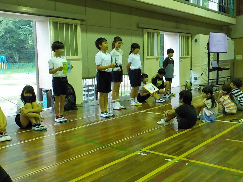 縦割り班になって「ふわふわことば(あったかことば)」をたくさん集めました! 集めた言葉の中から一つだけ選んで班ごとにみんなに発表をしました