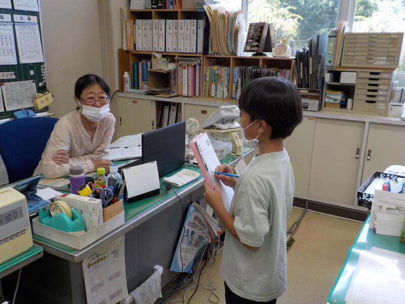 1年生は、算数で数直線の学習をしていました。「交代しよう!」「いいよ!」とノートの交換をして見せあっこ。 あたたかい声が飛び交っていました