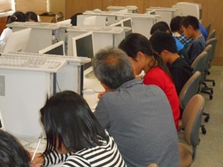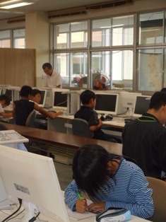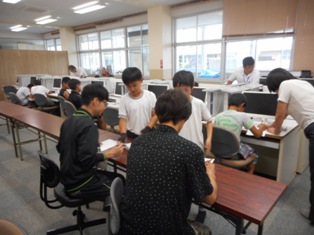 27日(木)は前日夜の雨で御船高校のグラウンド状態が悪く、熊本大学の学生ボランティアも加わり、PCルームでの学習に変更しました。子どもたちは総合運動部で体を動かしたかったみたいで残念だったと思いますが…。大学生にアドバイスをもらいながらプリントに一生懸命に取り組んでいました。