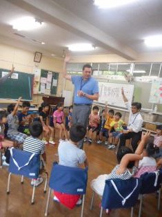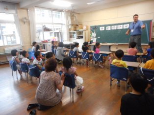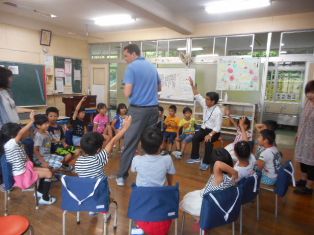 ALTのクリス先生、町学校教育指導主事の木下先生にご助力いただき、子どもたちが英語を体感し、コミュニケーション力を高める外国語活動を行っています。1・2年生にはフルーツバスケットなどのゲームも取り入れ、楽しく活動しています。