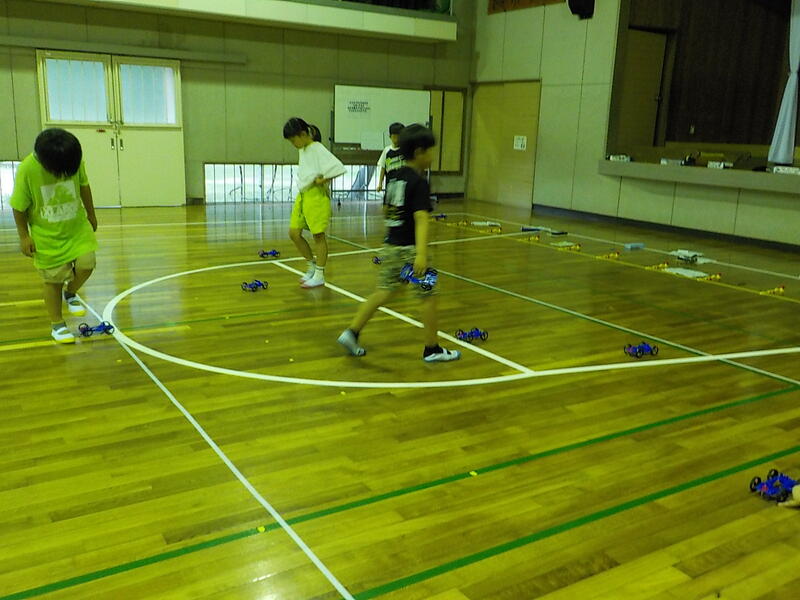 3年生は、「ゴムのものを動かす力」を調べるために、体育館で車を走らせて実験をしました! 車と一緒に走り回って、汗がびっしょり