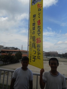 御船中学校グラウンドでの運動会で、子どもたちは少々戸惑いながらでしたが、工夫した練習もできました。写真の赤白応援団長たちの活躍も楽しみです。