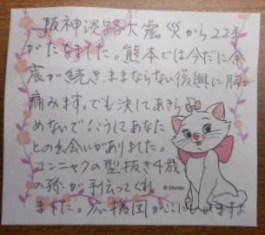 このメッセージカードは、昼食時に振る舞われたアトリエ太陽の子の支援者(元保育士)の方からのお弁当に添えられていたものです。4才のお孫さんが型抜きしてくれたコンニャク、伊達巻きは絶品でした。