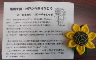 神戸のひまわり・おばさんからいただいたひまわりのブローチです。イメージフラワー”ひまわり”は、震災で傷ついた神戸の方々を癒してくれたと話されていました。本校も6月にアトリエ太陽の子どもたちからひまわりの絵をいただいています。