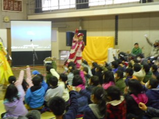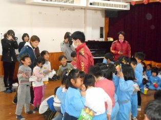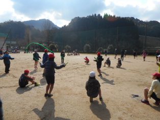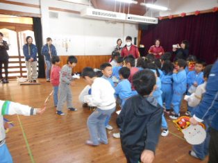 3日(金)、滝尾幼稚園との交流として1年生が豆まきに参加しました。鬼役も1年生と園児が交互にやりなが楽しく過ごすことができました。