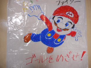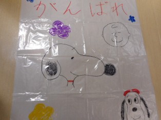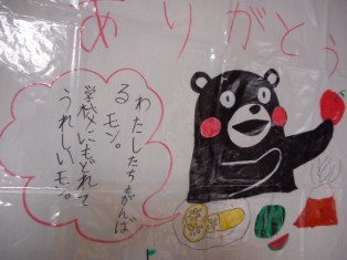 今週末行われる熊本城マラソンの出場ランナーに激励ポンチョを全校児童で制作しました。くまモンなどのキャラクターの絵とともに、熊本への支援に感謝する気持ちを込めた言葉を書き添えています。滝尾小の子どもたちが制作したポンチョを身にまとったランナーの皆さんの完走を祈っています。今回のポンチョには滝シシも描かれています。滝シシの県下へのお披露目?です。