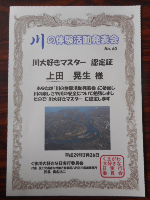 私にも『川大好きマスター認定証』をいただきました。ありがとうございました。松浦代表から「(諸事情で参加できなかった)保護者の皆様にもよろしくお伝えください」との伝言を承りました。