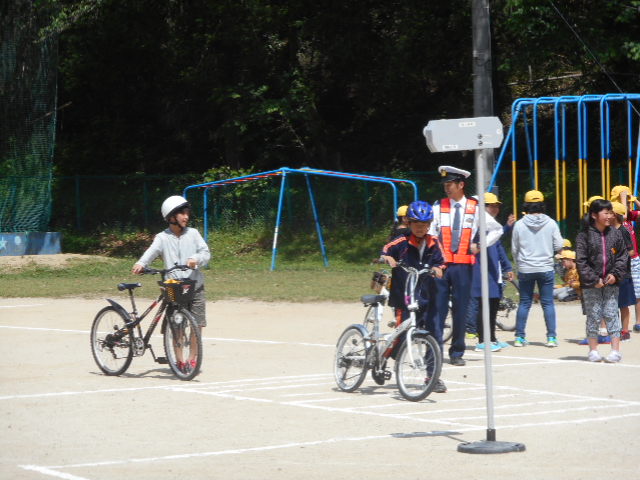 8日(月)の2・3校時、御船警察、町役場、交通指導員さん方にきていただき、道路の歩行・横断、自転車の乗り方などについて指導いただきました。あわせて町内の自転車店にお願いして自転車点検も実施しました。