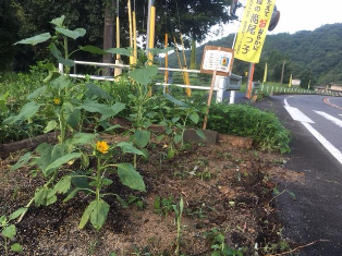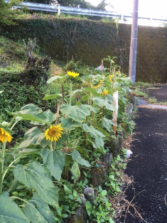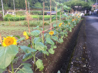 6月から児童会で種まき・水やりなどをして育てた”復興のひまわり”の苗を夏休み前から校区6カ所(玉虫仮設・竹の迫・下鶴・下梅木・水越・正門道路向)に地域の皆さんにご協力いただき植えました。夏の陽射しを受け元気に育ち、見頃を迎えました。