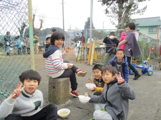14日(日)、横野・御船台のどんどやに出向きました。燃え上がる炎にこの一年の無病息災を願いました。子どもたちは美味しそうに温かい豚汁と焼いた餅をほおばっていました。