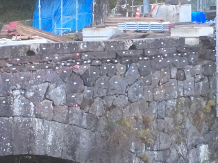熊本地震で痛んでいた下鶴橋の架け替え工事が始まっています。現在は、橋の組石に番号が振られ、解体が進められています。