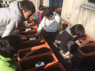 子どもたちと昼休みなどに、一人1プランター、球根5個をそれぞれ植えました。3月中旬頃に開花前のチューリップを町内仮設住宅に届けたいと考えています。また、球根が多数のため、プランターが準備できなかった球根については、町内各小中学校に配付することにしました。