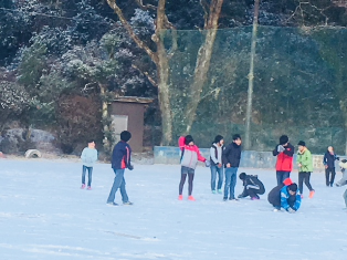 そんな寒い日にも子どもたちは雪を楽しんでいます。校庭で雪を投げ合って遊んでいます。