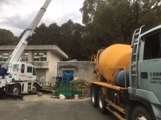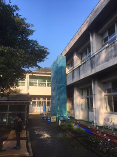 年度末を迎え、給食室の給食受入施設としての改修、熊本地震による2階4年教室ベランダ庇の亀裂補修工事が行われています。子どもたちには工事現場はもちろん、工事関係車両にも注意するよう指導しています。