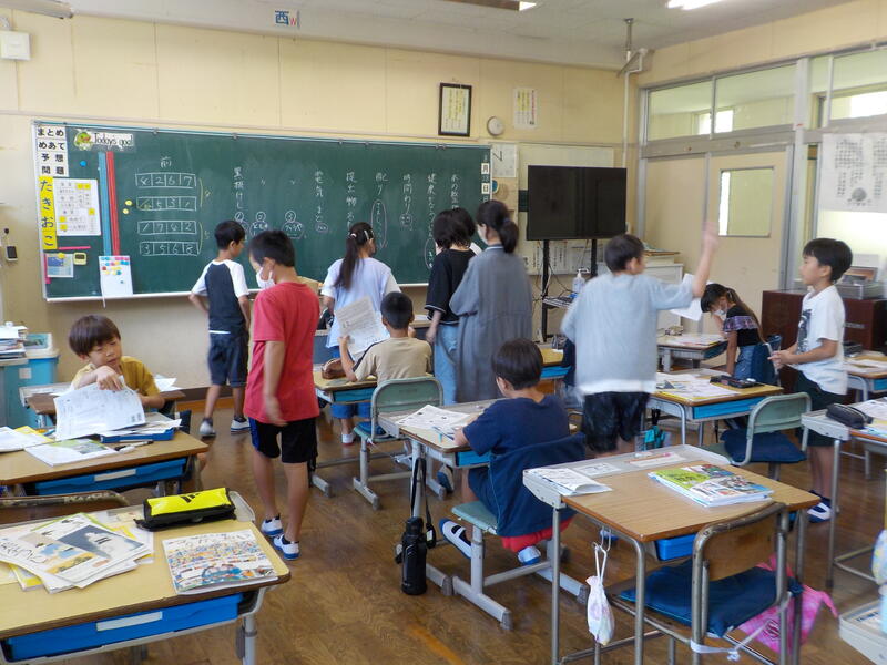 そうじの時間に、今日は地区児童会をしました。どの地区も話し合いを一生懸命していました。2学期も安全な登下校に心がけましょう。