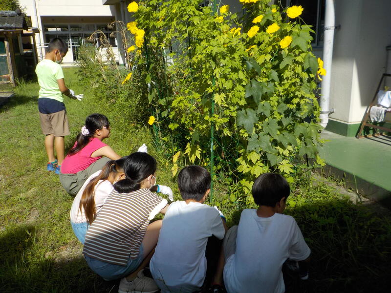 4年生の理科の時間、今日は2学期の最初の授業なので、花壇の草取りをしました!
