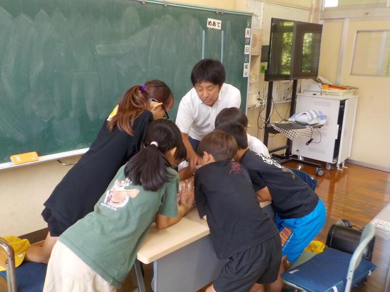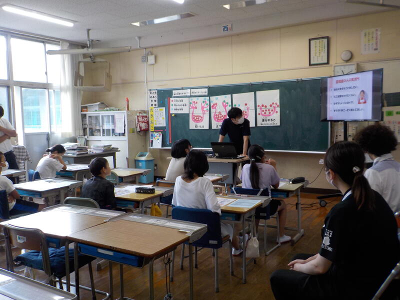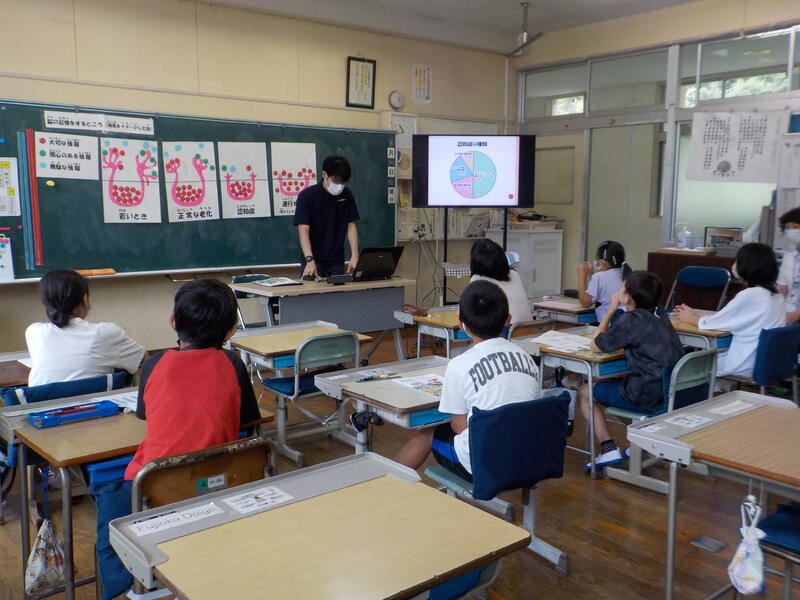 御船町役場福祉課より紫垣様、永本様、希望ヶ丘病院より蜷川様に来ていただいて、認知症の科学的な仕組みや認知症の方への接し方などを、詳しく教えていただきました。5年生は、真剣に学習に臨みました
