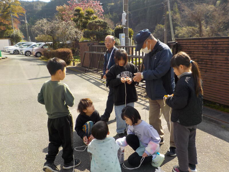 こままわし、こまに巻きつけるひものやり方を丁寧に教えてもらいました! でも、なかなかこまが回らない