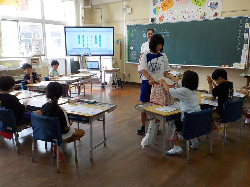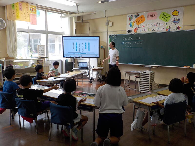 1年生の音楽では、「ぶんぶんぶん」の歌に合わせて手拍子でリズム打ちの学習でした! リズムうちを一緒にしたり、タンバリンを1年生のみんなに配ってくれたりしました! 1年生もとても楽しく学習できました