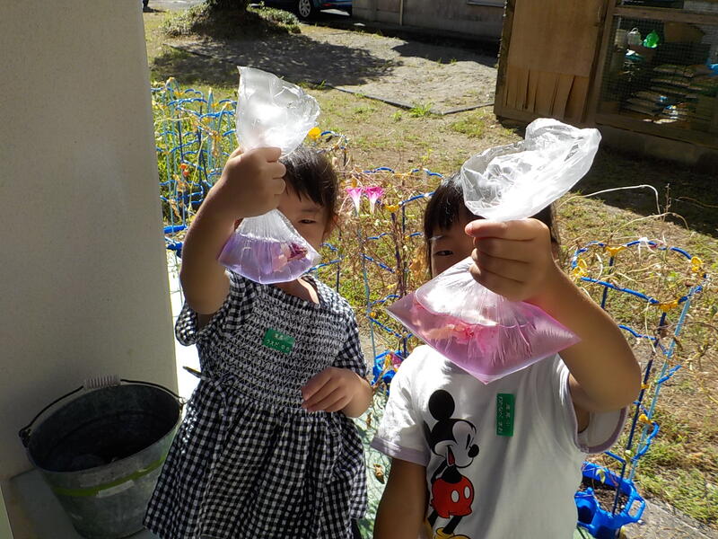1年生は、カラフルに咲くアサガオで色水遊びに夢中です