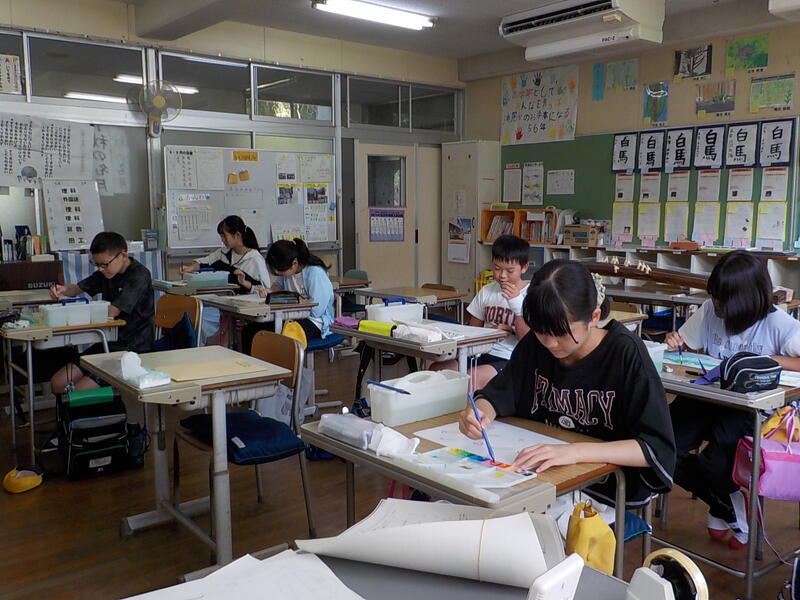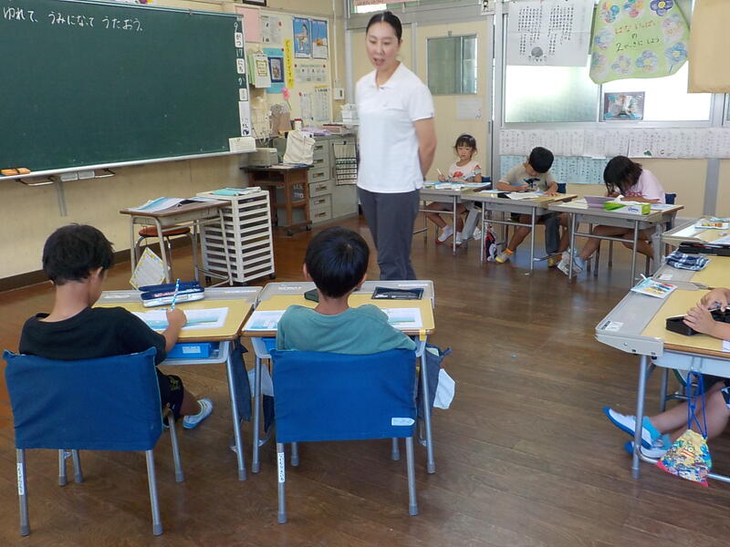 1年生は音楽で、「うみ」の歌野イメージをふくらませていました! 1年生が描いた海の絵の中には、魚が泳いだりかもめが飛んだりしていました
