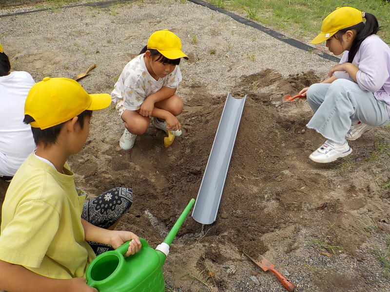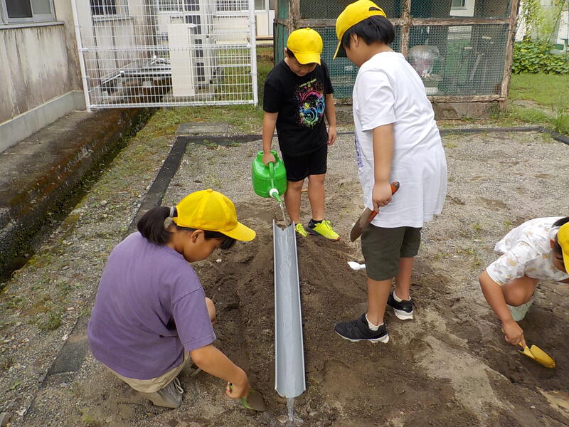 4年生は、理科「雨水のゆくえ」の学習で、「水は、高いところから低いところへ行くのか」を調べました! 確かに!水は、少しでも低いところを探して流れて行きました