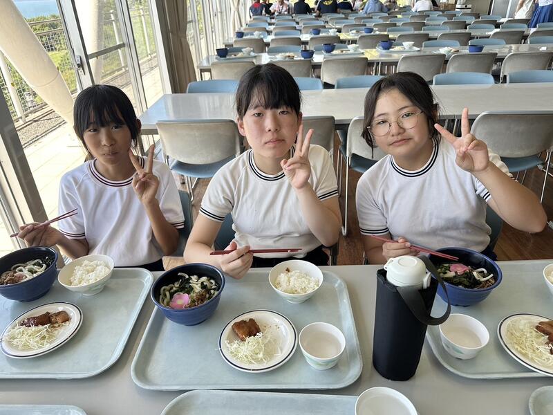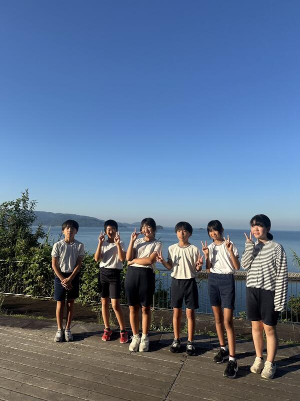 朝の海をバックに、元気そうな6人の顔^_^ 朝の集いが終わりましたね! 今日も頑張ってください!