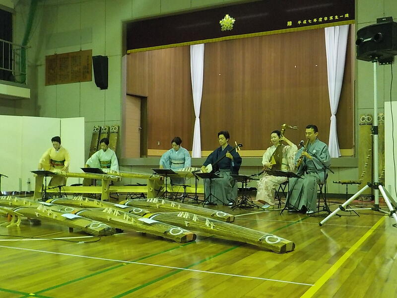 箏、十七弦、三味線、尺八、琵琶を使って、たくさんの曲を演奏してくださいました! 後半は、6年生も参加して、「さくらさくら」の演奏をしました! 6年生はとても上手に演奏をしたので、演奏家の方々にたくさん褒めていただきました