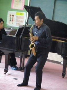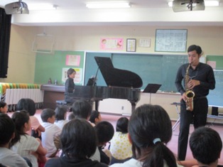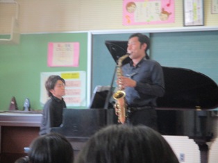 4日(水)、熊本県立劇場アウトリーチ事業による山﨑 明(やまさき めい)さんによるサックスフォンコンサートを行いました。ピアノ伴奏の山城英樹(やましろ ひでき)さんとお二人のすばらしい演奏を聴くことができました。