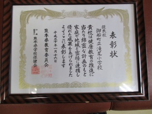 熊本県教育委員会及び熊本県学校保健会より、健康づくり推進学校表彰として「優良校」表彰を受けました。保健室を中心とした日頃の健康教育の取組とともに、今年度はPTA活動での「歯と口の学習会」の実施などが評価されたものです。子どもたちの健康づくりに、さらに邁進してまいりたいと思います。