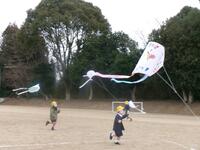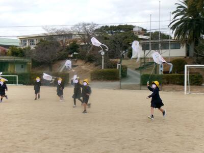 4年生が総合的な学習の時間で福祉の学習をしており、来年入学予定の園児との交流を兼ねて、お世話になっている保育園と学童、そして、年長児さんにお花のプレゼントを届けました。その後、少しの時間でしたが、「だるまさんがころんだ」で一緒に遊び、交流をもちました。