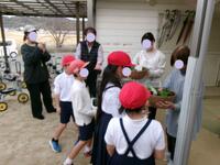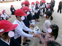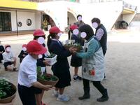 4年生が総合的な学習の時間で福祉の学習をしており、来年入学予定の園児との交流を兼ねて、お世話になっている保育園と学童、そして、年長児さんにお花のプレゼントを届けました。その後、少しの時間でしたが、「だるまさんがころんだ」で一緒に遊び、交流をもちました。