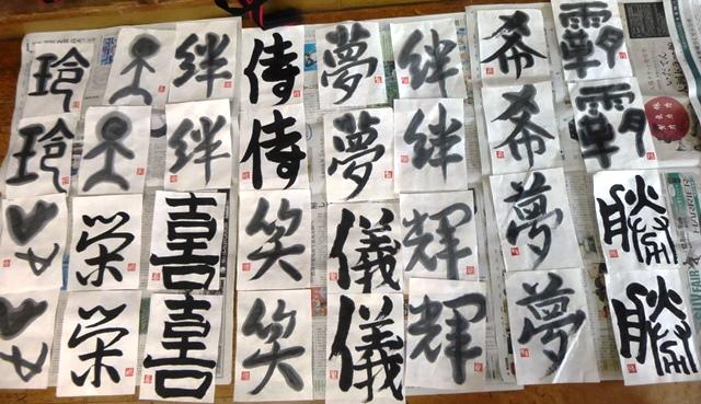 2月27日(水) 今日の5・6校時、6年生が教育委員の笠先生を講師にお招きして、創作書道に取り組みました。文字や書き方を自分で選び、熱心に取り組みました。すばらしい作品ができあがりました。