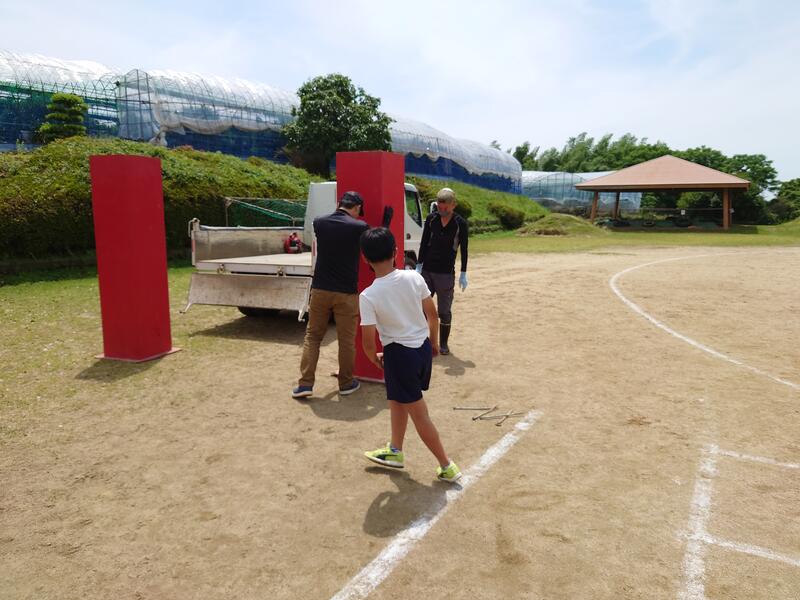 5月28日、PTA体育部、環境部、文化部の皆さんに、29日の運動会の準備をしていただきました。主な内容は、三角旗張り、駐車場づくり、遊具の固定、テントの移動などです。