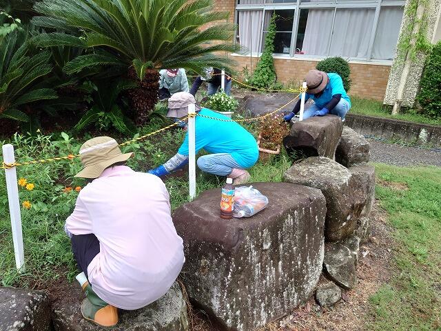 雨上がり後の晴天で、蒸し暑い中での2時間の作業でした。熱中症予防のために今回は、一人当たり2本のペットボトルのお茶を用意していただきました。また、開始1時間後には休憩を入れました。